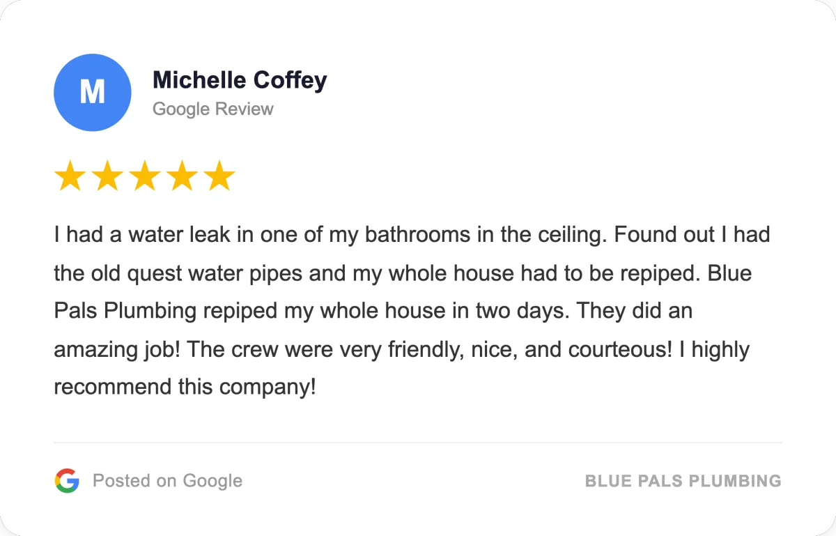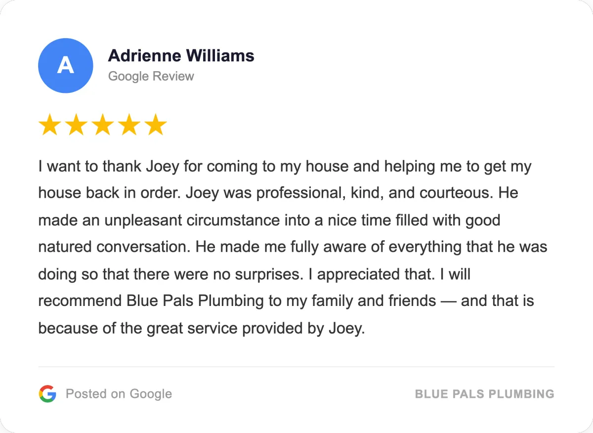 When someone searches for plumbers near me or residential plumbing repair, they are usually looking for a company that shows up, communicates clearly, and respects the home. Blue Pals Plumbing is positioned for quality-focused homeowners, not bargain-only shoppers, which is exactly how this campaign was designed. That makes this section a good place to reinforce trust: licensed local plumbers, honest recommendations, dependable workmanship, and responsive service for homes across San Diego and nearby communities.